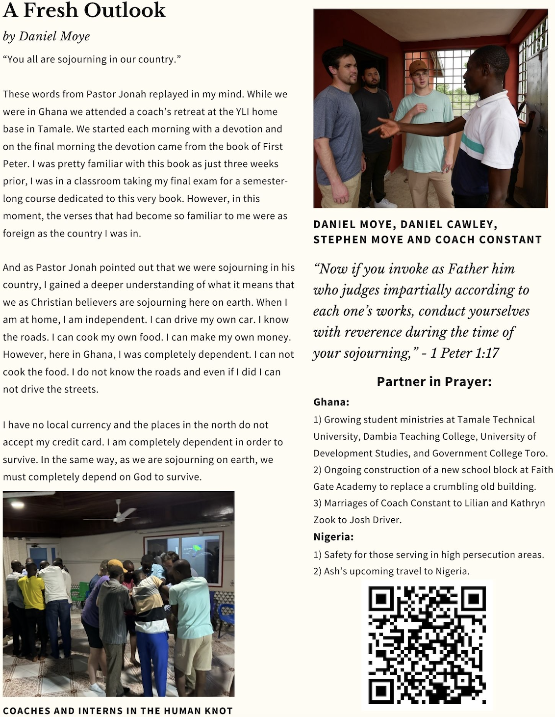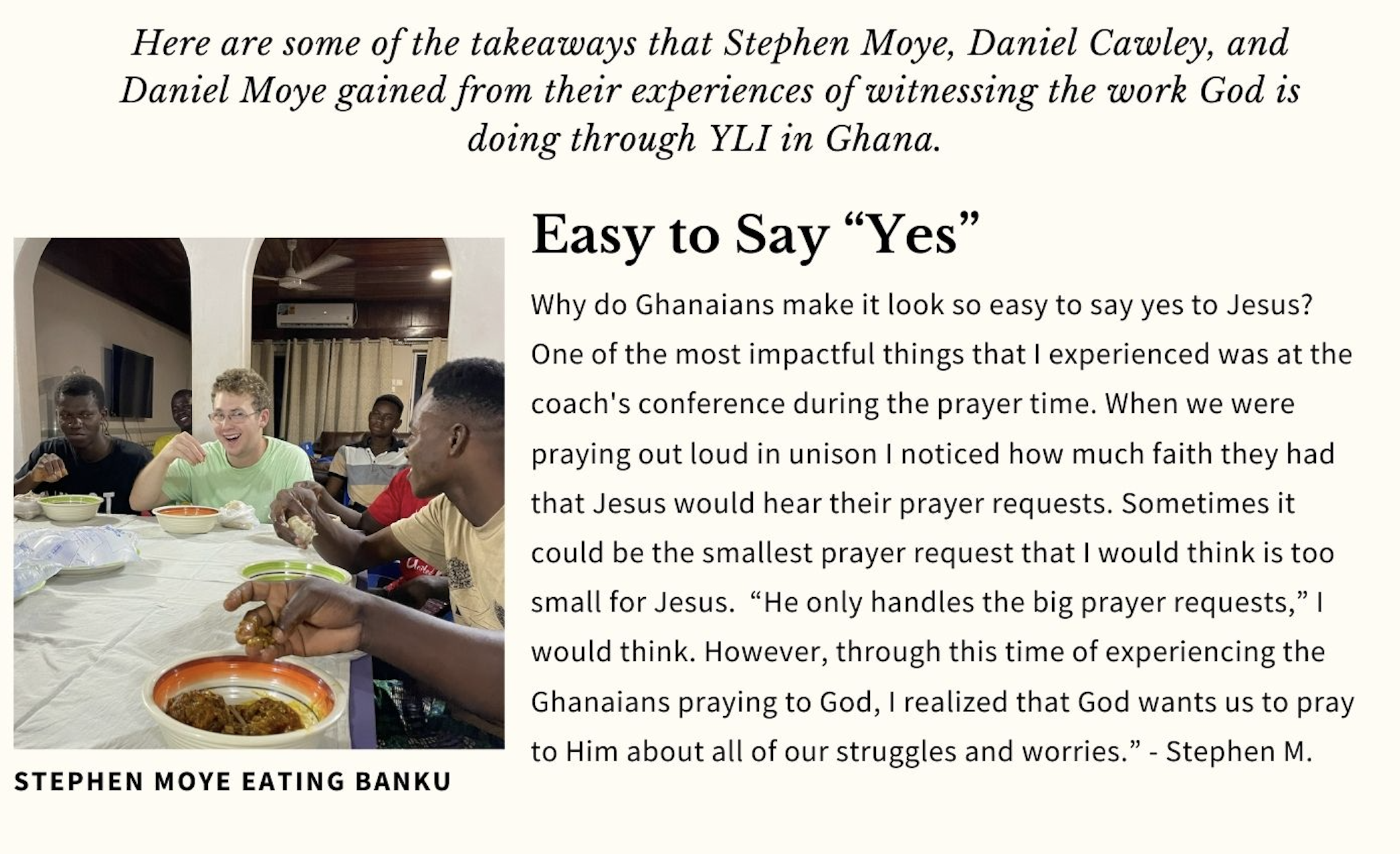 In my early YLI years, I arrogantly assumed that all this prayer was for show, a way of demonstrating personal piety. Not at all. It was I who had a faulty understanding and needed to be discipled in prayer by Vincent, Jonah, and Naomi. The Coaches knew better than me the limits of their human agency, and that if God didn’t show up, all would be lost. This awareness did not decrease their own effort. It motivated them to work tirelessly in ministry, knowing that although they bring nothing to the table, God can always be relied upon to show up with His 100%.