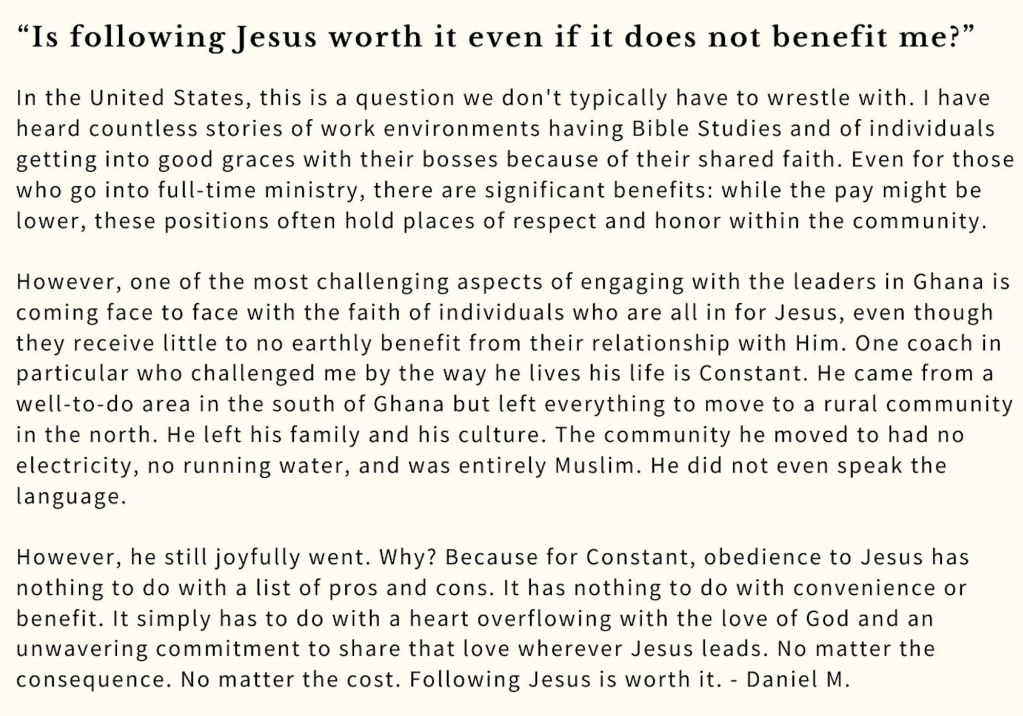 Over the years I’ve noticed that my West African friends have a more innate awareness of their human smallness in comparison to God’s ineffable ability. For them, “the spiritual” is not a separate reality to the physical and material world. Rather, God’s presence, as well as the dangers of spiritual darkness are as interwoven into reality as the person sitting next to you. The opportunity of approaching the throne of God in prayer is not taken for granted. Prayer proceeds every meeting, meal, and especially, road trip.